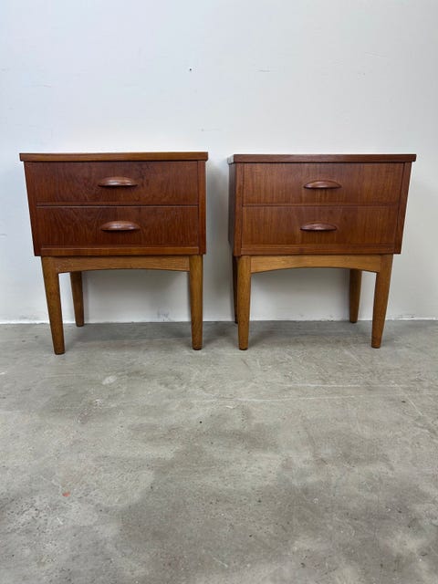 Sengeborde i teak og eg