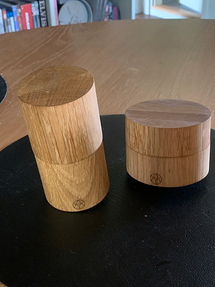 Køkken med køkkenø i grå og trælook
