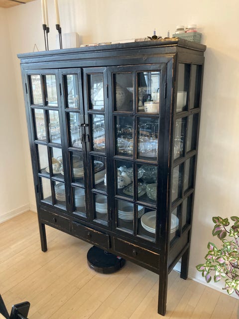 Sort vitrineskab med skuffer.