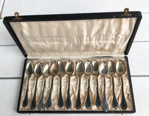 12 teskeer af tretårnet sølv