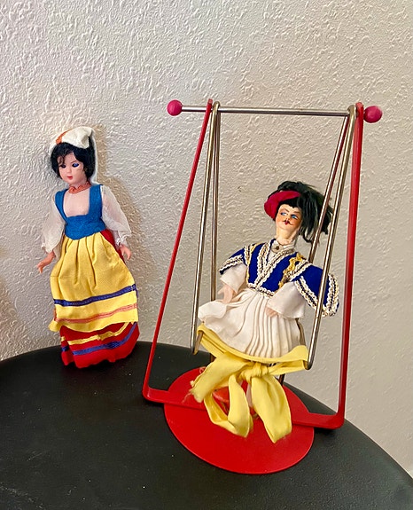 Antik jern gynge og 2 dukker