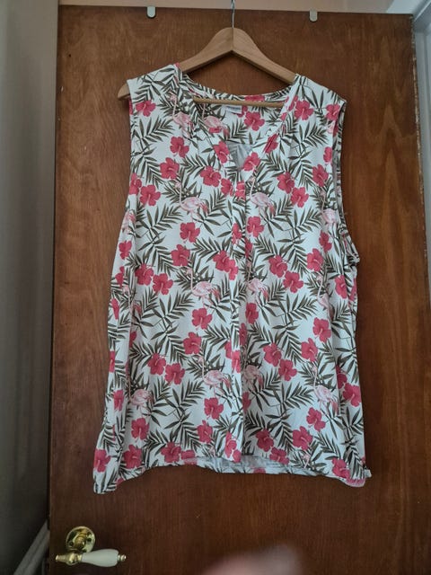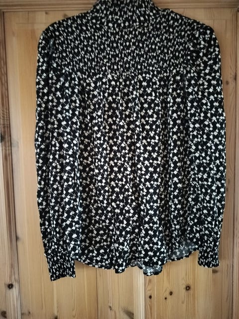 Ny Flot MADS NØRGAARD bluse i blå og hvid med kort ærme, fleksibel stof, str. L.