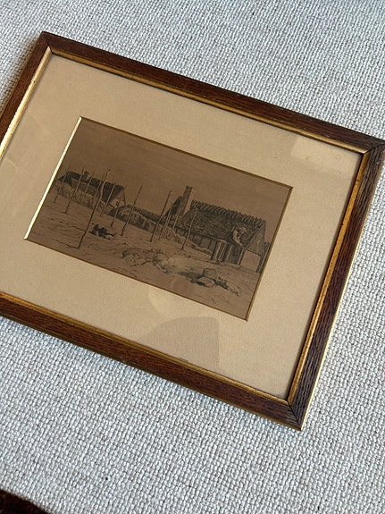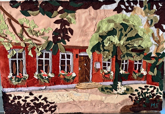 Collage, applikation af gammelt hus.
