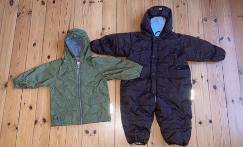 Om vinteren kan små børn holdes varme ved at klæde dem godt på: uldne heldragter, sokker, handsker, huer og overtøj. En flyverdragt er ofte hurtigere at tage på end separate jakker og bukser, og sne kommer ikke så nemt ind. I annonce(r)ne bør du tjekke tilstanden af overtøjet, fx hvor godt manchetter og ben kan strammes, om tøjet har mange reflekser, og om det er vandtæt.