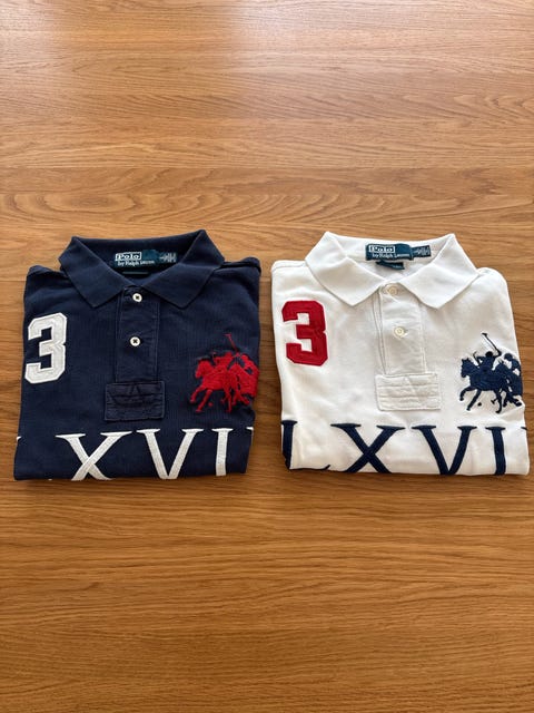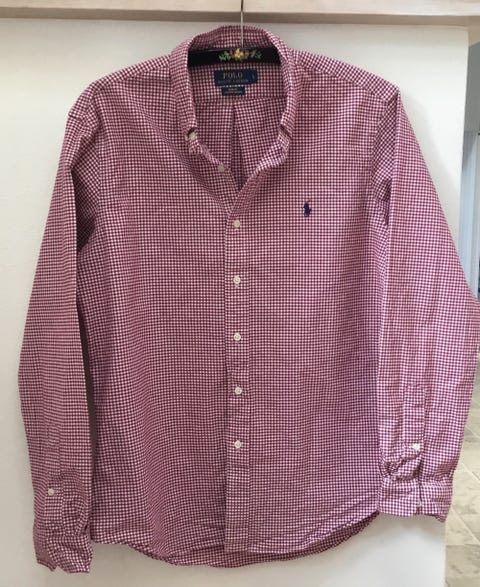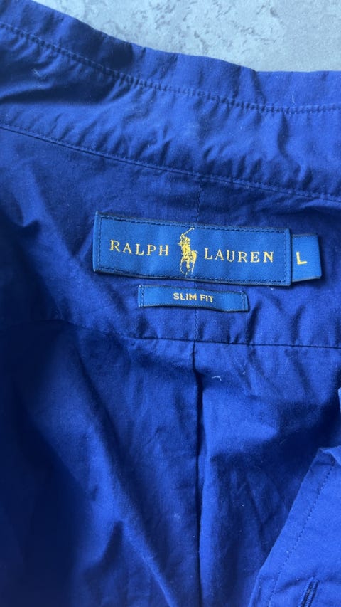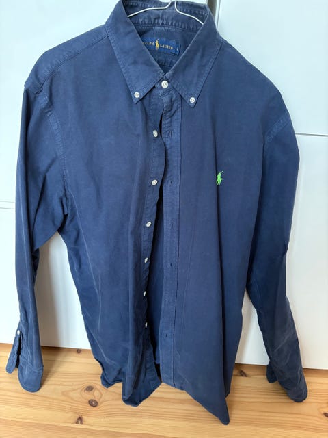 Ralph Lauren skjorte, Large, slim fit, lyseblå med hvide striber og lyserød polo