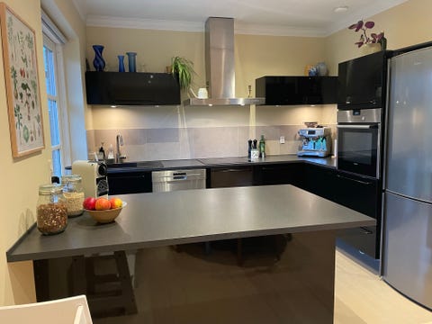 Svanekøkken med hårde hvidevarer