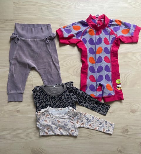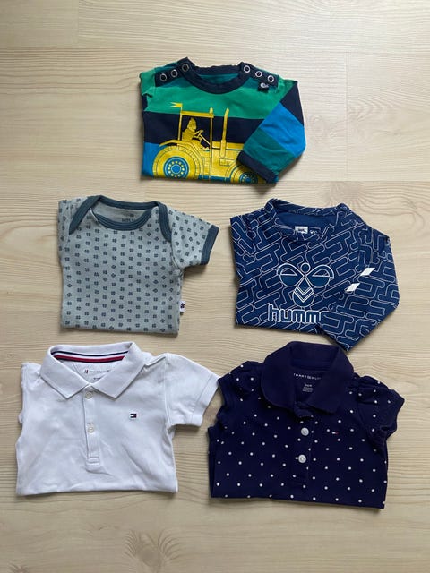 Du bør have nok børnetøj til, at du ikke behøver at starte vaskemaskinen konstant. Overvej om du kan købe noget brugt: For eksempel bliver babybodyer let snavsede, og det er godt at have rigeligt af dem i en familie med babyer. Smukke børnetrøjer og kjoler bliver ofte for små efter kun enkelte brug, og det er godt at sælge dem og dermed forlænge tøjets levetid. Hvad angår overtøj, kan vinter- og mellemsæsonens overtræksdragter eksempelvis købes brugt, da særligt overtræksdragter fra kvalitetsmærker tåler flere børns kravlen og tumlen i sne og sjap.