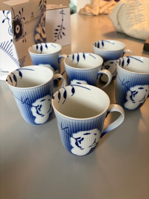Royal Copenhagen Blå Mega Riflet kaffekopper med underkopper porcelæn hvid blå