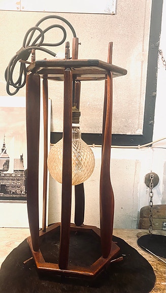 Trælampe med lys og en stofledning