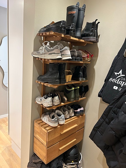 Snedkerlavet skoreol med opbevaring