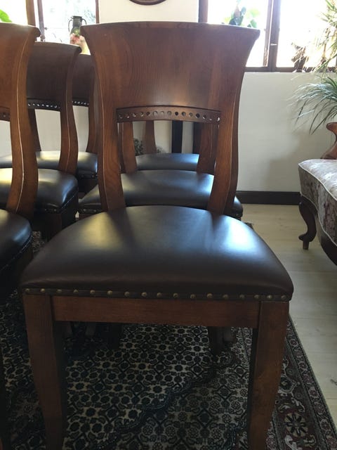 8 stk egetræs stole med læder sæde.