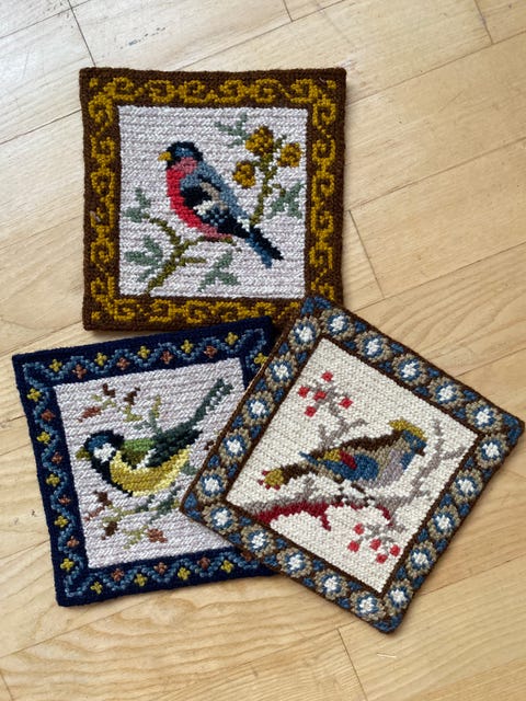 Tre broderede fuglebilleder