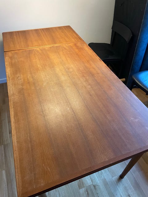 Ældre teaktræ bord med udtræk.