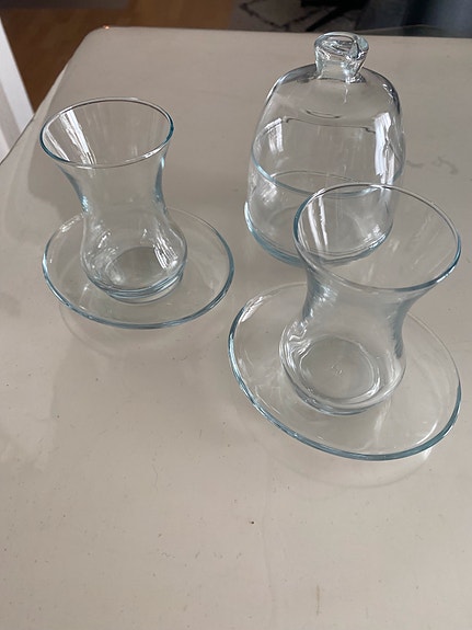 Glas, 2 løse kopper og skål.