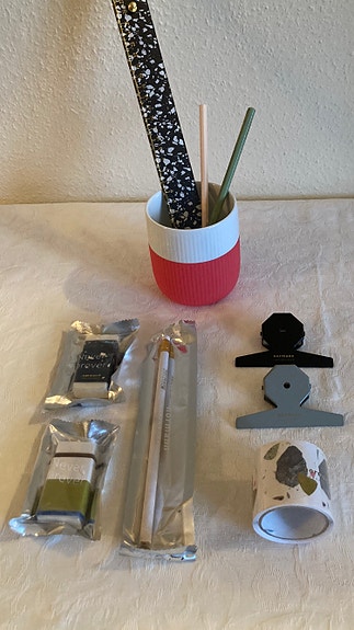 Daily Fiction: linial, viskelæder, clips til papir, blyanter og klistermærker