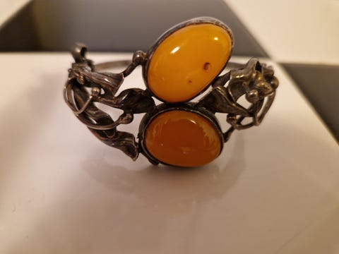 500 kr.Sølv 925 armring bangle med rav art nouveau stil svungne former vintage smykkeHørve2. juniSkjold AntikFøj til favoritter.