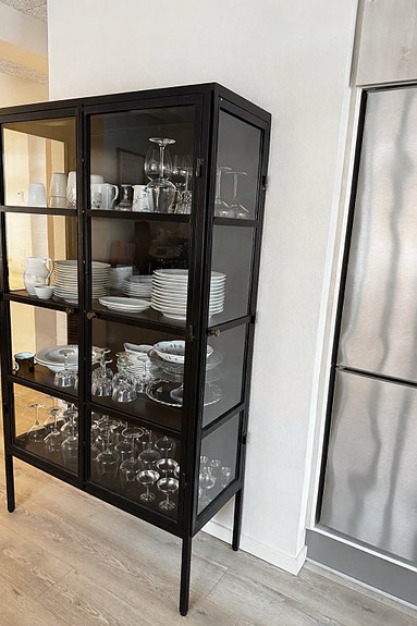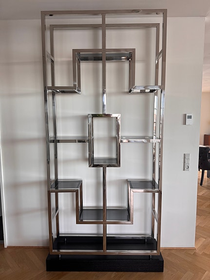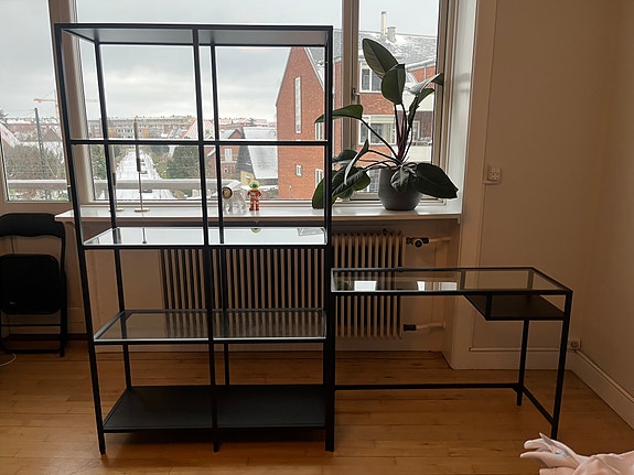 Reol i metal med glas hylder