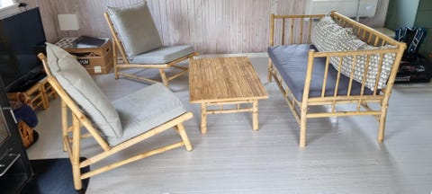 Sofa, 2 stole, sofabord - Bambus