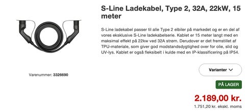 Ladekabel til elbil, 22kw, 15 meter