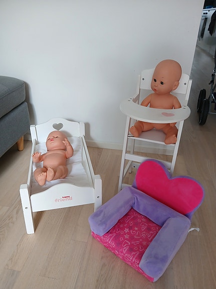 2 dukker, seng, stol