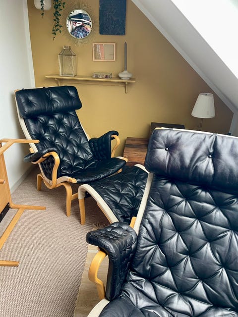 Sort læderstol med skammel