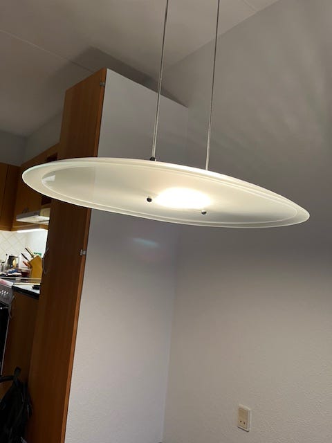 Pendellampe i hvidt glas og metal