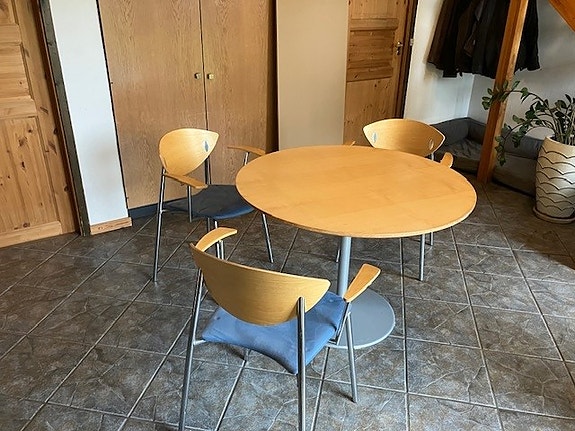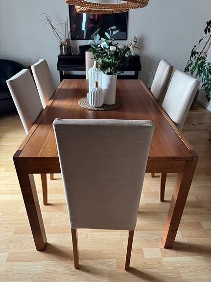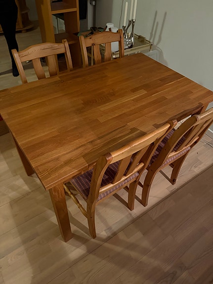 Udbordt egetræsbord med 6 stole
