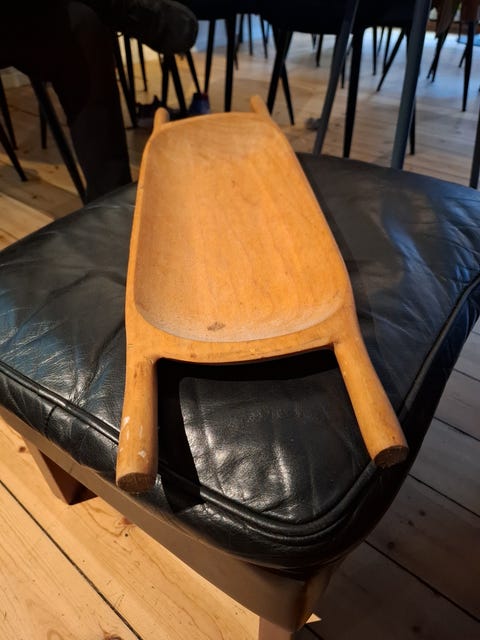Lænestol i lyst læder, med skammel