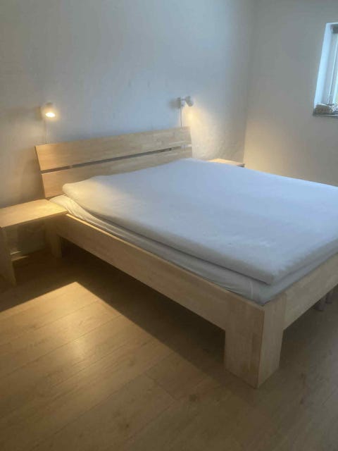 Træseng med sengeborde i lyst træ.