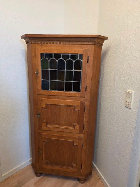 Hjørneskab i træ med glasdør