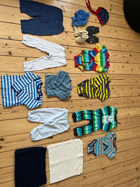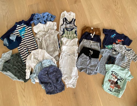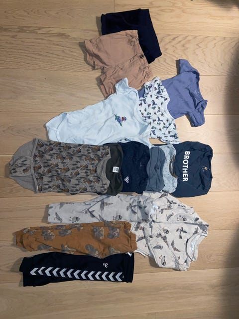 Du bør have nok børnetøj til, at du ikke behøver at starte vaskemaskinen konstant. Overvej om du kan købe noget brugt: For eksempel bliver babybodyer let snavsede, og det er godt at have rigeligt af dem i en familie med babyer. Smukke børnetrøjer og kjoler bliver ofte for små efter kun enkelte brug, og det er godt at sælge dem og dermed forlænge tøjets levetid. Hvad angår overtøj, kan vinter- og mellemsæsonens overtræksdragter eksempelvis købes brugt, da særligt overtræksdragter fra kvalitetsmærker tåler flere børns kravlen og tumlen i sne og sjap.