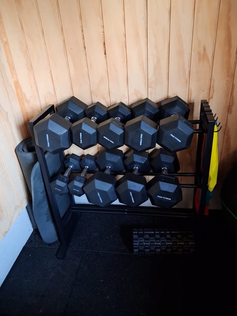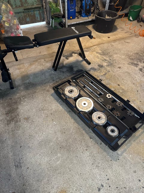 Justerbar træningsbænk og håndvægte