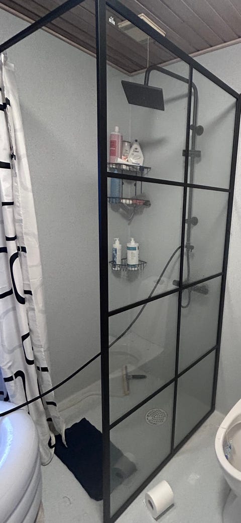 Brusekabinen og skillevæggen beskytter resten af badeværelset
