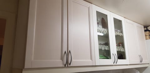 Skab med glaslåger og hylde