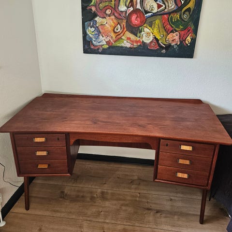 Hans Olsen Frem Røjle 1950 , Lænestol Sort skal med Teak Træramme , sæde skai ,