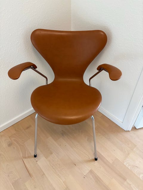 Arne Jacobsen 3207 Syver Armstole – Nypolstret i Cognac Læder & Sort Stel 7er