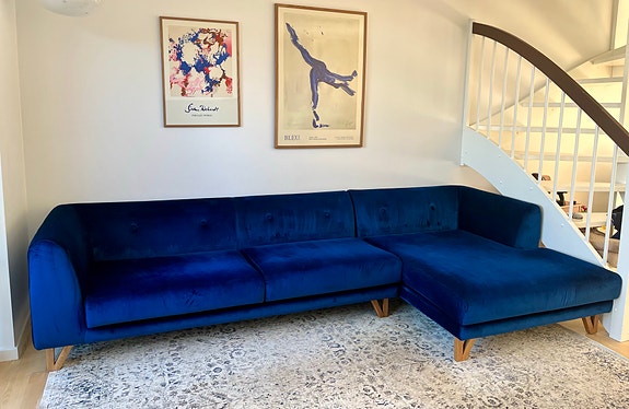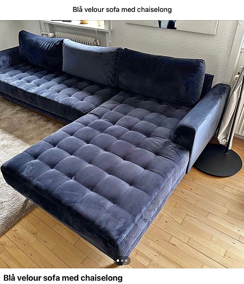 Blå velour sofa med chaiselong