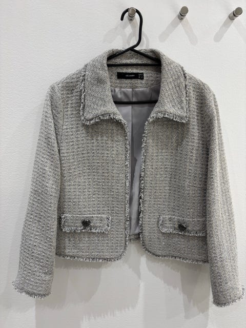300 kr.Lys grå boucle Hallhuber jakke meget kort og med 3/4 ærmeStr. 42Valby3 dageFøj til favoritter.