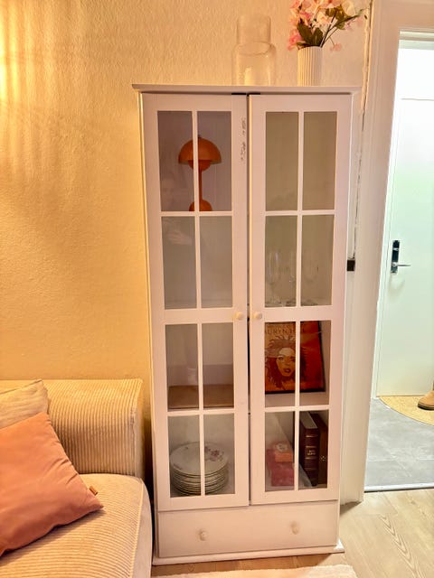 Skab med glaslåger og hylde