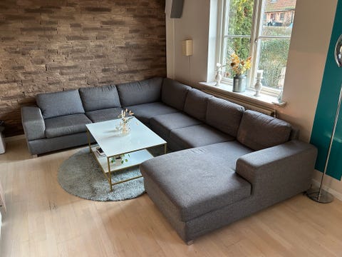 Rødbrun hjørne sofa og sofabord