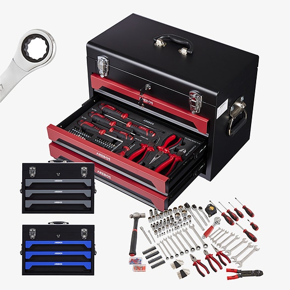 Arebos® Værktøjskasse inkl. 172 dele krom vanadium-værktøjssæt, 3 rum - Rød
