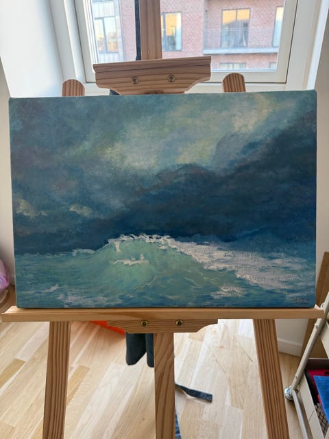 Maleri havmotiv lærred blågrøn