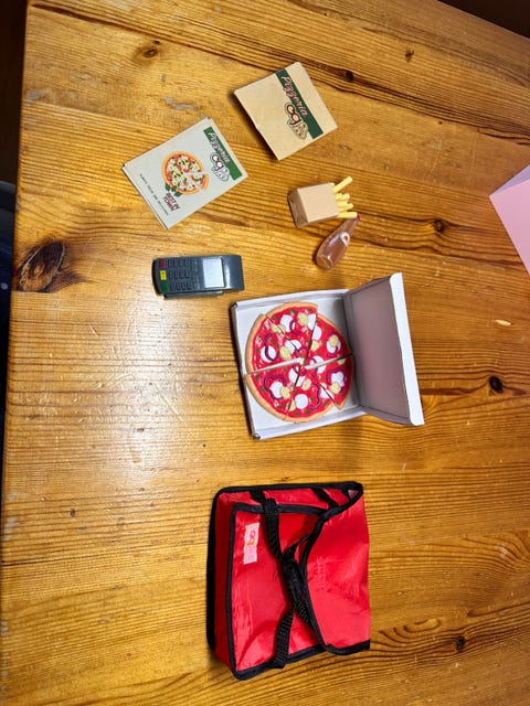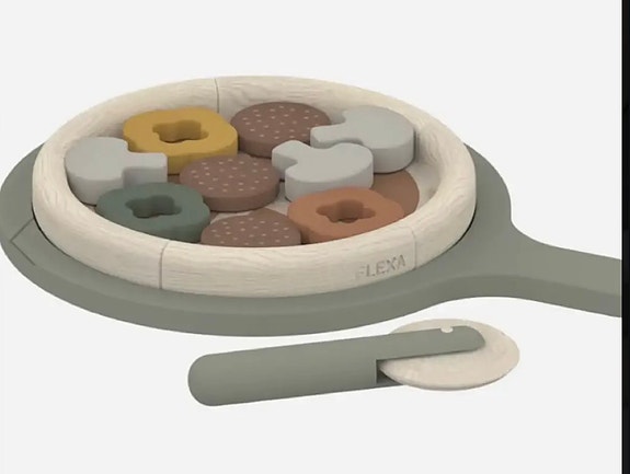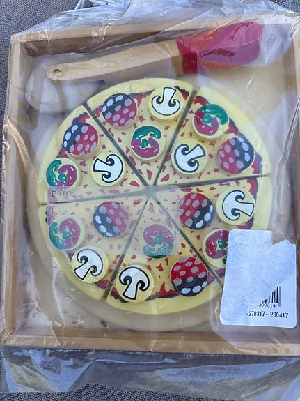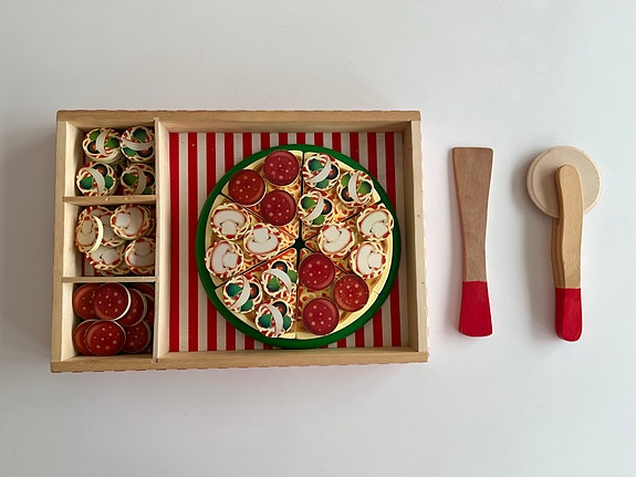 Pizza i træ og stof.