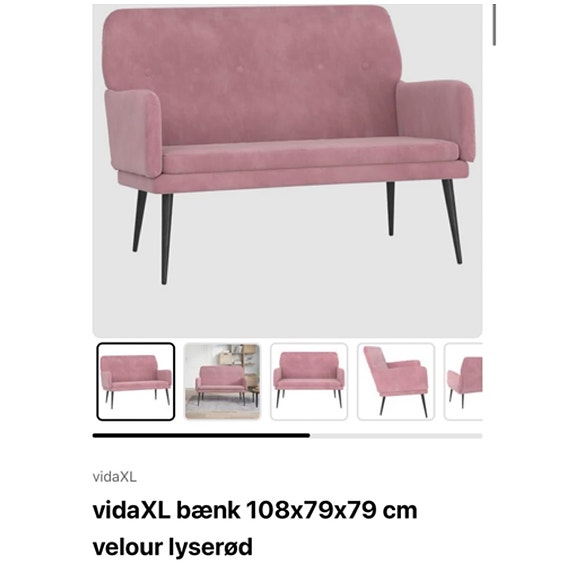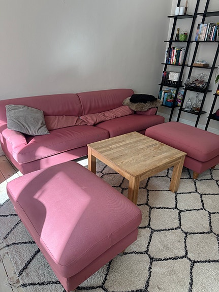 Lyserød velour sofa med puf