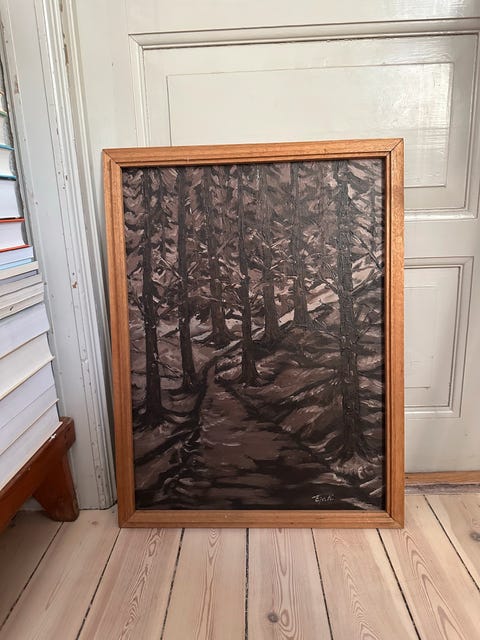 Stort Maleri med skovmotiv og hjorte