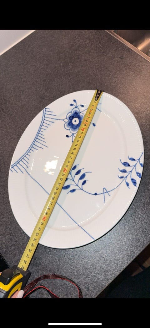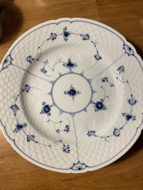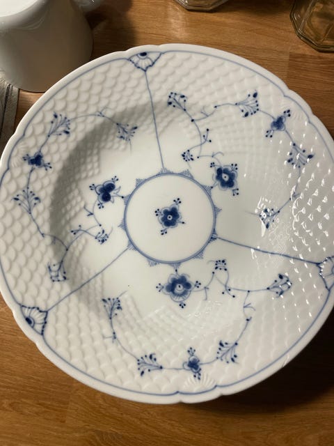 Lille dyb tallerken i Musselmalet, Riflet med tyk kant fra Royal Copenhagen.