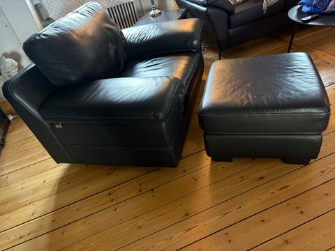 Røde læder lænestole med puf.