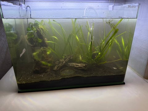 Akvarium med planter og filter