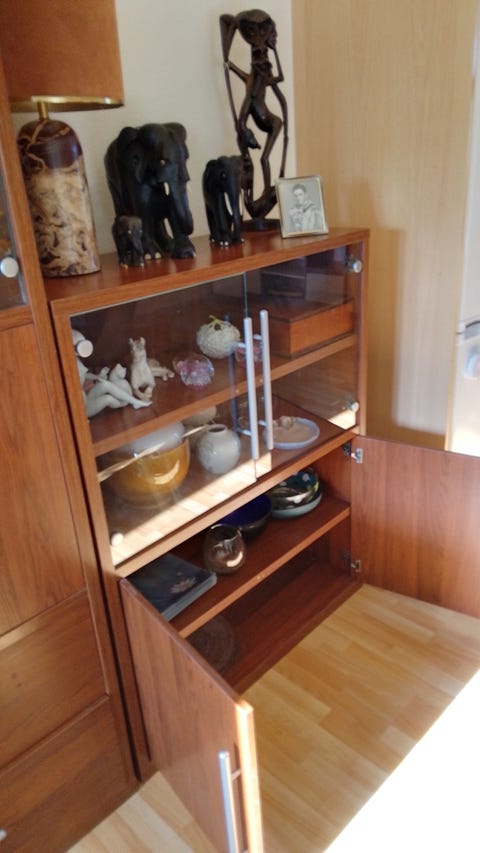 Reol med skuffer og glasskab