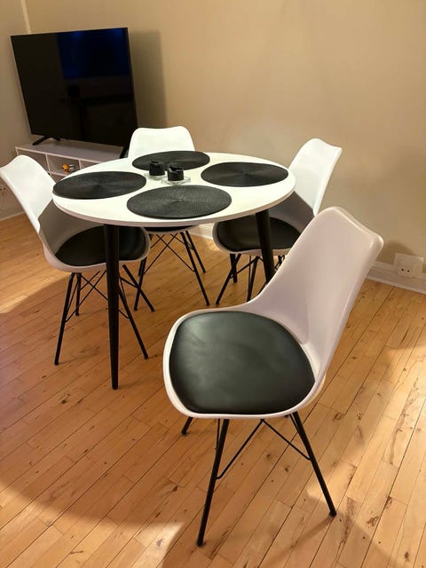 Rundt spisebord med plade og 4 stole